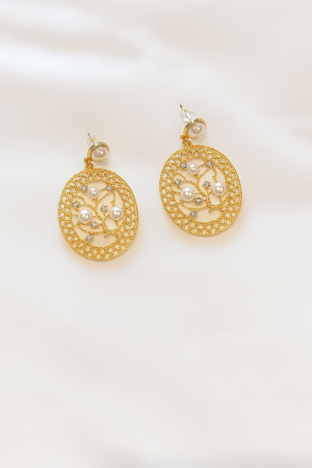 Celeste Bloom Earrings combine vintage elegance with celestial-inspired design. Featuring a delicate gold filigree oval frame, these lightweight statement earrings are adorned with luminous pearls and shimmering stones — reminiscent of a blooming constellation. Perfect for romantic evenings, weddings, or adding a graceful glow to your everyday style, these gold pearl earrings offer timeless charm and feminine sophistication in every detail.