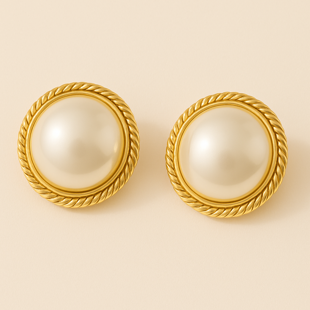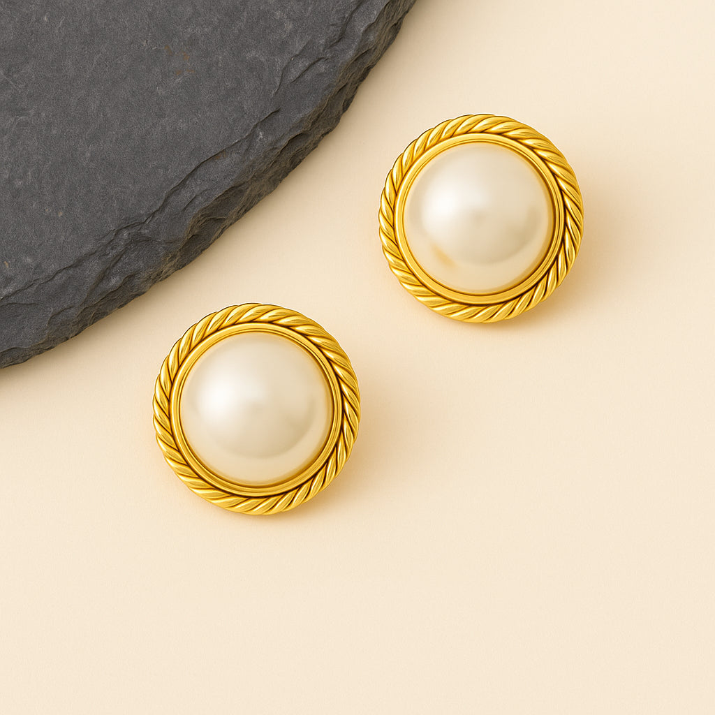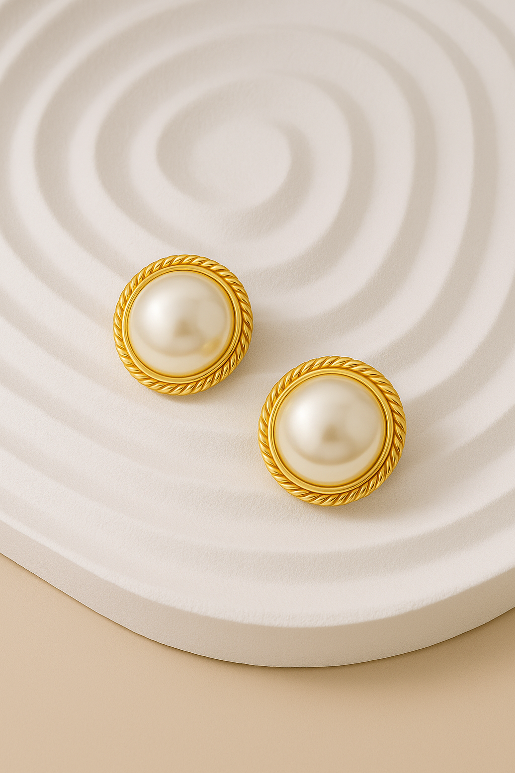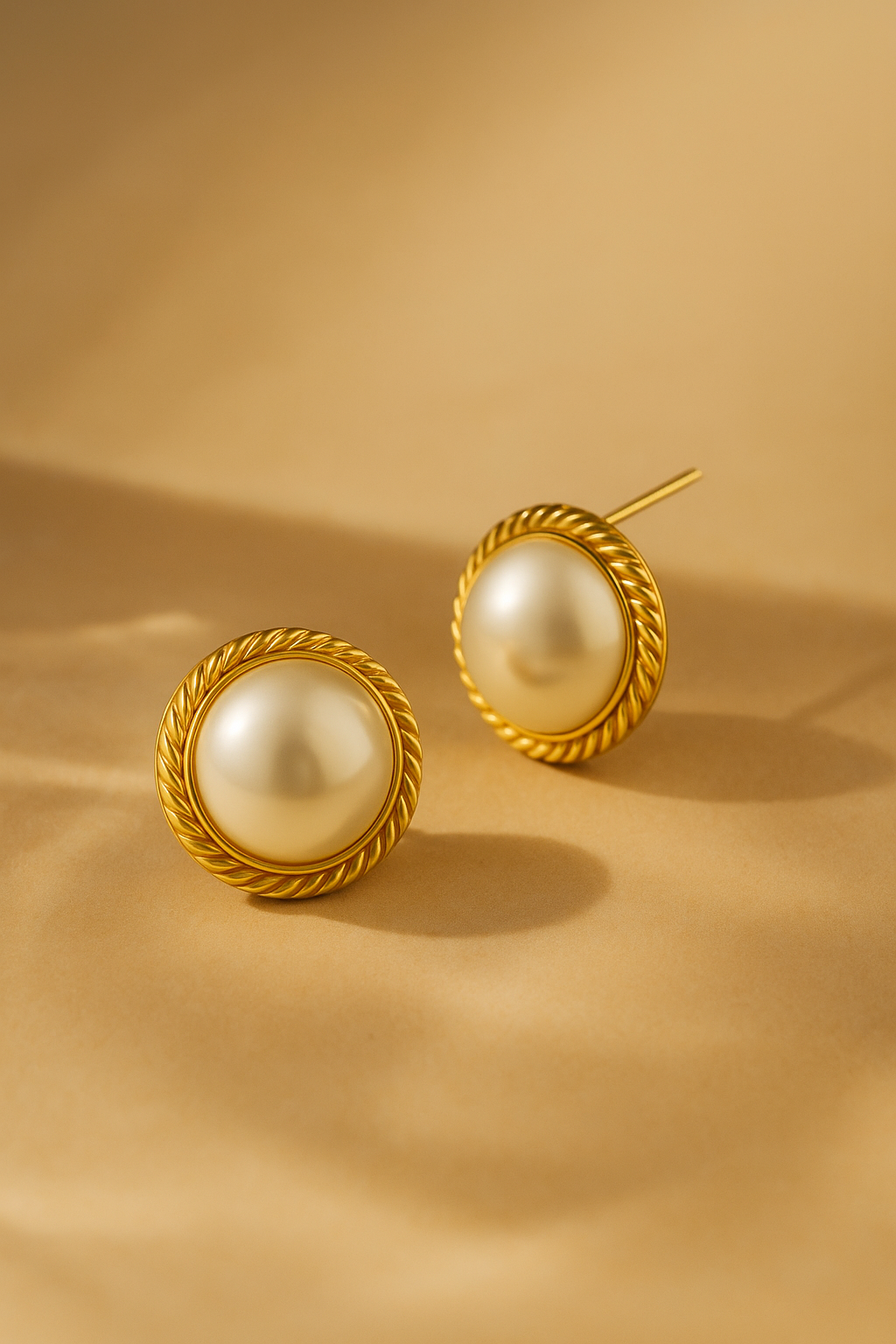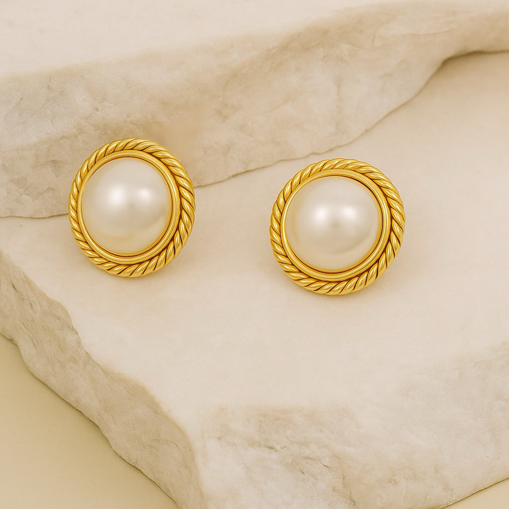 Crown Pearl earrings celebrate timeless elegance with a regal twist. Featuring a luminous domed pearl encircled by a twisted gold frame, they recall vintage royal jewelry with a modern finish. Refined yet powerful, these studs are ideal for adding a touch of grace and stature to any outfit — from tailored blazers to silk blouses.