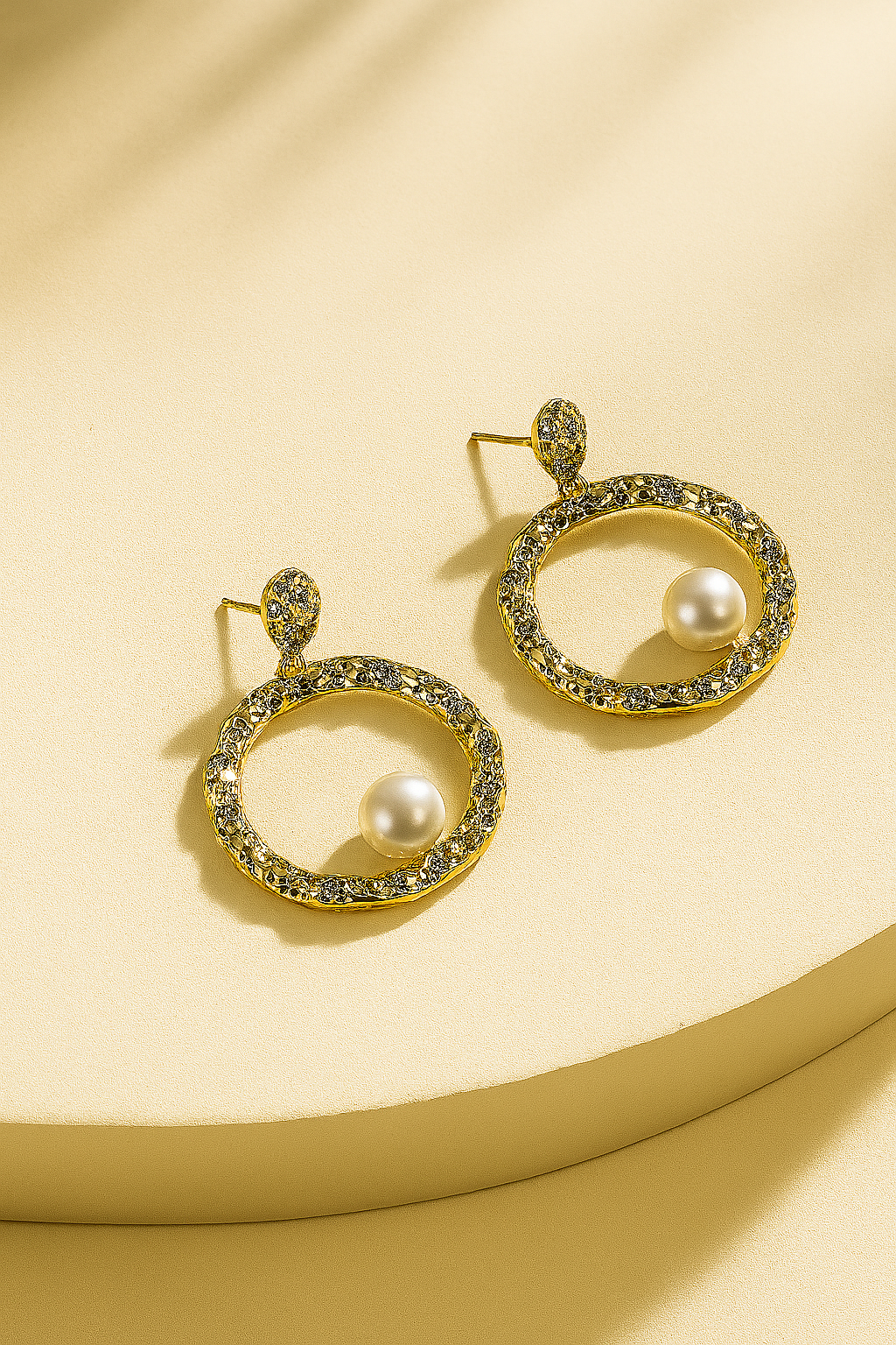 Gilded Moonlight earrings feature a luminous faux pearl nestled in a textured gold halo, encrusted with sparkling stones. Inspired by the serene glow of a full moon wrapped in twilight, these elegant stud earrings blend classic charm with celestial beauty. Lightweight and timeless, they’re perfect for adding soft radiance to both everyday and evening looks.