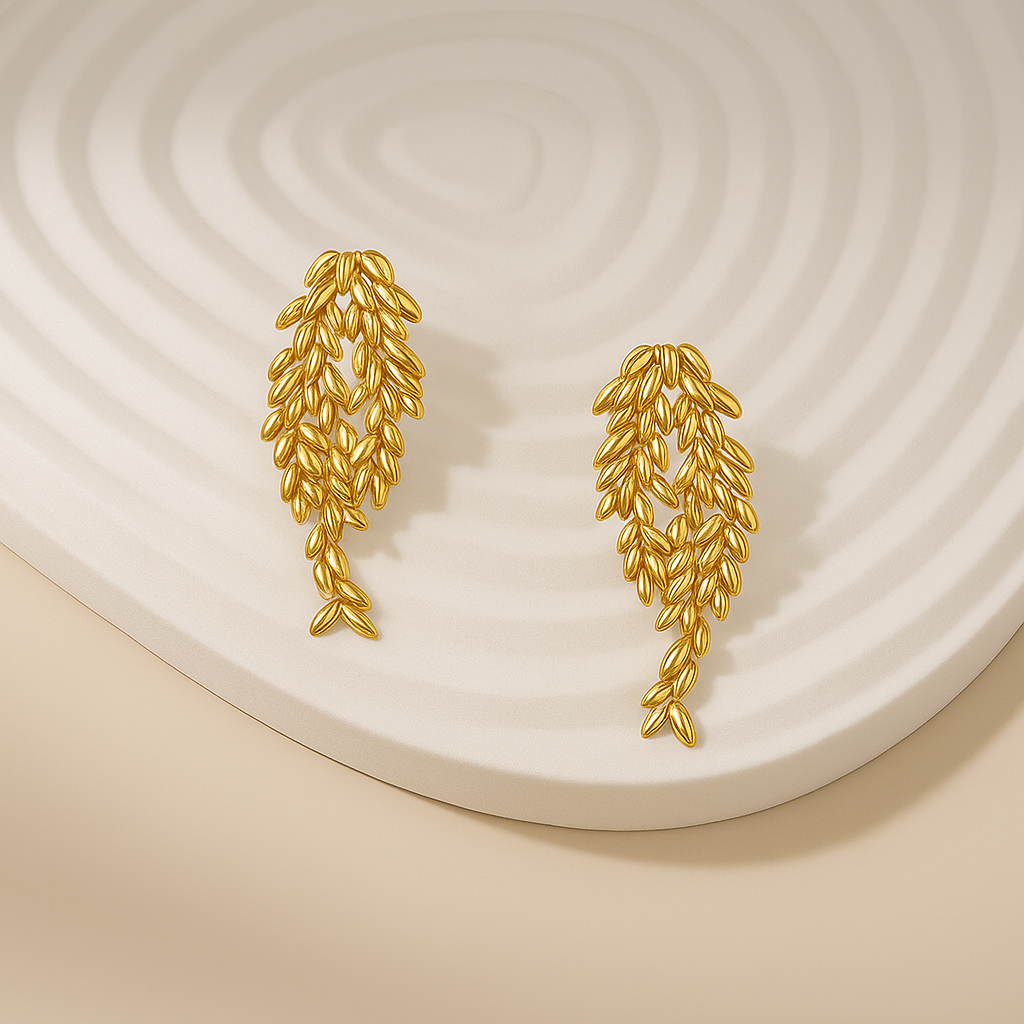 Golden Wheat Cascade earrings capture the graceful beauty of nature through layered gold-toned grains that fall in a flowing cascade. Inspired by ripened wheat fields swaying in the breeze, these earrings bring a sense of movement, warmth, and texture to your look. Lightweight yet full of presence, they’re ideal for those who love elegant jewellery with a natural, earthy charm.