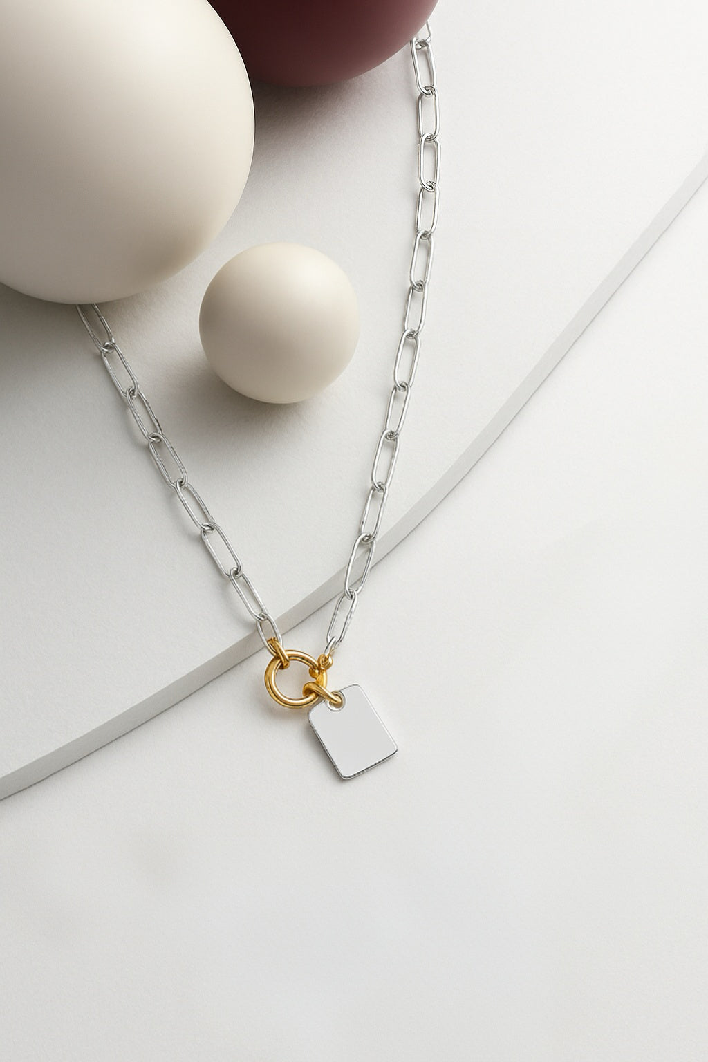 Luna Tag Necklace redefines bold minimalism with clean lines and mixed-metal contrast. Featuring a long, high-polished silver chain, a sleek rectangular tag pendant, and a striking gold toggle clasp, this piece adds sculptural balance and modern edge to any outfit. Perfect worn solo for subtle impact or layered for a statement look — it’s a necklace that expresses individuality, structure, and quiet confidence.
