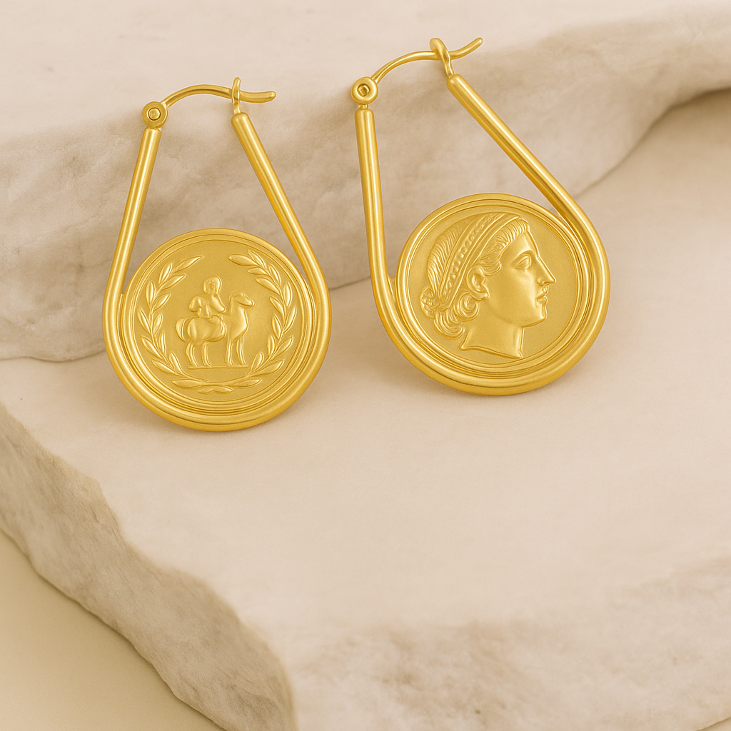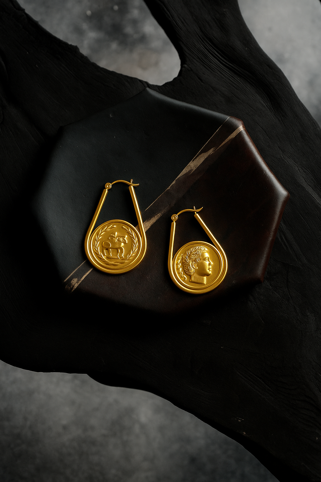 Step into timeless elegance with the Mythos Drop Gold Earrings. Inspired by ancient coins and classical Greco-Roman artistry, each earring features embossed details of heroic profiles and laurel wreaths. The asymmetric design adds a modern edge to their vintage charm, creating a statement piece that blends history, symbolism, and bold sophistication. Perfect for those who love jewellery with meaning and character.