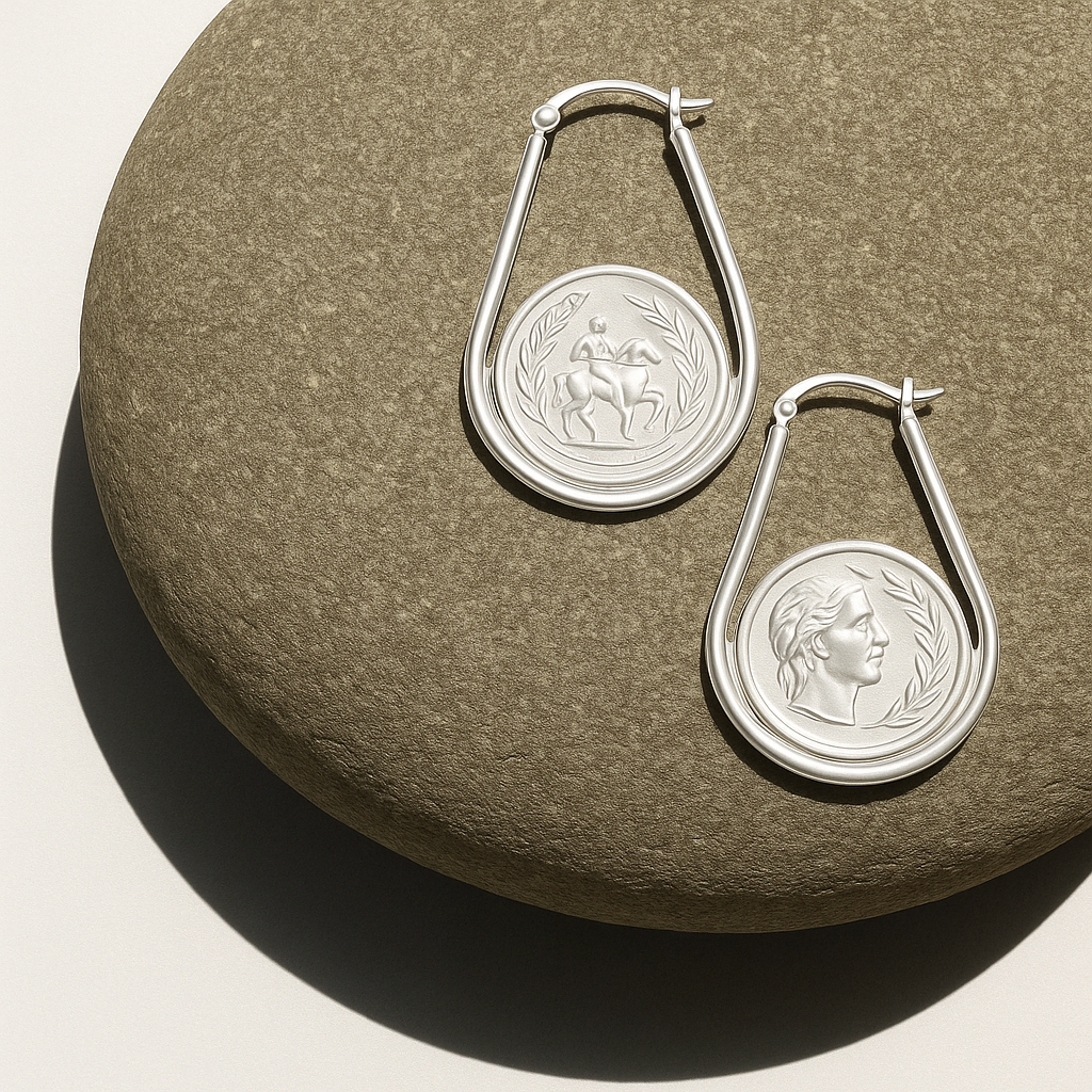 Channel the power of ancient legends with the Mythos Drop Silver Earrings. Crafted in sleek silver and adorned with embossed Greco-Roman symbols, this pair combines classical inspiration with modern minimalism. The asymmetric medallion design speaks of duality — balancing strength and grace, past and present. A bold yet refined piece for lovers of history, symbolism, and statement accessories.