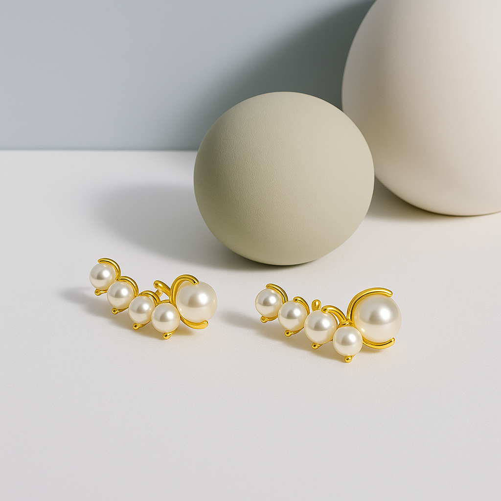 Gracefully flowing like a wave of light, the Pearl Cascade Earrings offer a modern reimagining of timeless pearls. Featuring a sculptural arc of lustrous pearls in graduated sizes, elegantly framed by sleek gold curves, these ear climbers hug the ear with both softness and structure. Feminine, refined, and bold in their simplicity — they bring quiet luxury to both everyday wear and special occasions.