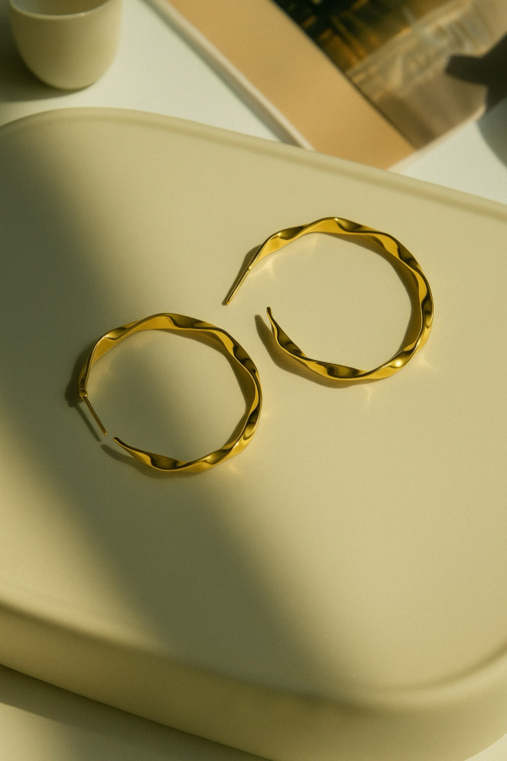 Ripple Hoops bring fluid elegance to your everyday look. Featuring an organic, wave-inspired silhouette and a radiant gold finish, these lightweight statement earrings capture the energy of movement and modern sophistication. Designed for all-day wear — from casual mornings to evening occasions — they’re the perfect blend of comfort, shine, and sculptural style.