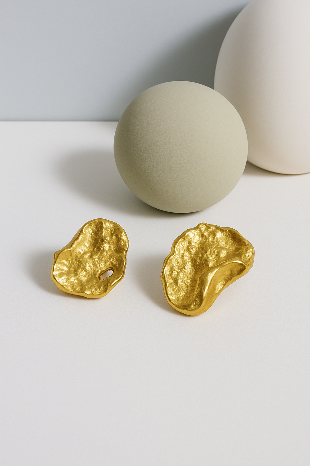 Sculpted Calm studs blend artistic form with a sense of quiet strength. Featuring an organic, hand-sculpted silhouette and a soft matte gold finish, these earrings evoke natural calm and raw elegance. Lightweight yet expressive, they’re perfect for adding subtle individuality and minimalist charm to your everyday look.