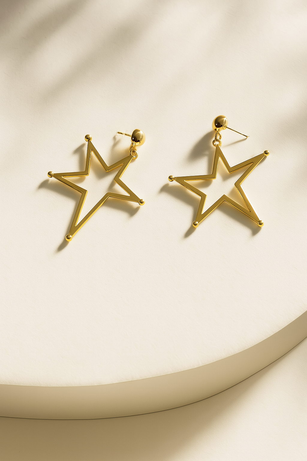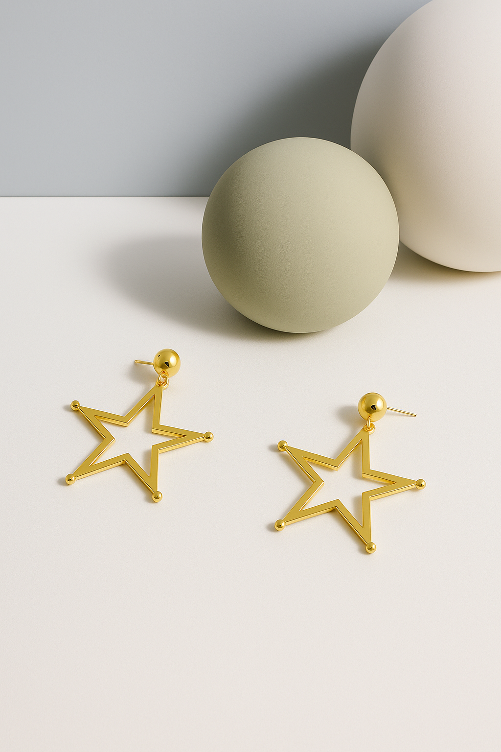 Shine bright with the Stellar Earrings — bold open-frame star designs that bring a touch of celestial magic to your everyday look. Crafted in a lightweight gold-toned finish, these earrings make a playful yet powerful statement. Perfect for parties, festivals, or adding a radiant spark to casual wear.