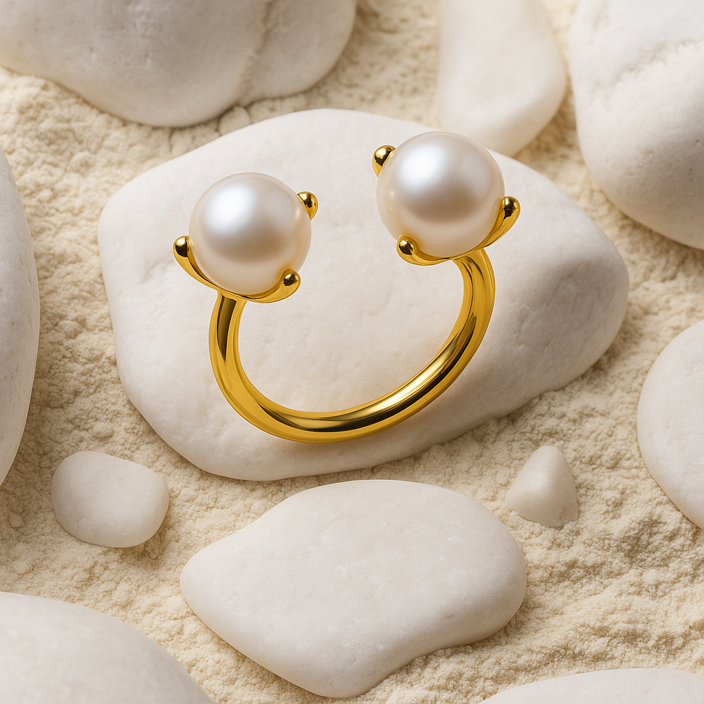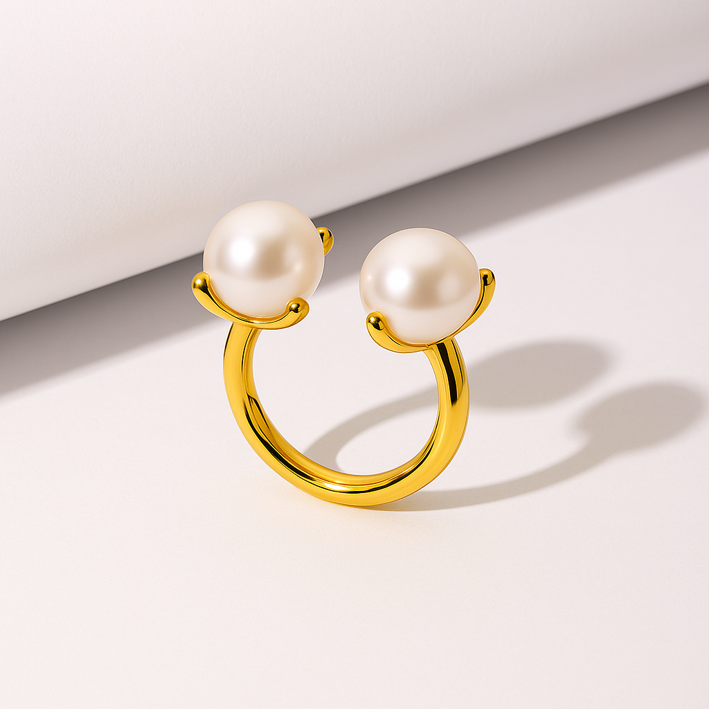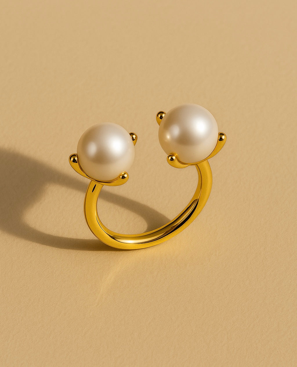 A contemporary symbol of balance and beauty, the Twin Bloom Ring features two luminous faux pearls blooming from each end of a polished gold arc. The open-ended design adds a sculptural edge, while the smooth curves and contrasting elements evoke harmony and boldness. Lightweight and adjustable, it’s the perfect finishing touch for everyday elegance or evening refinement.