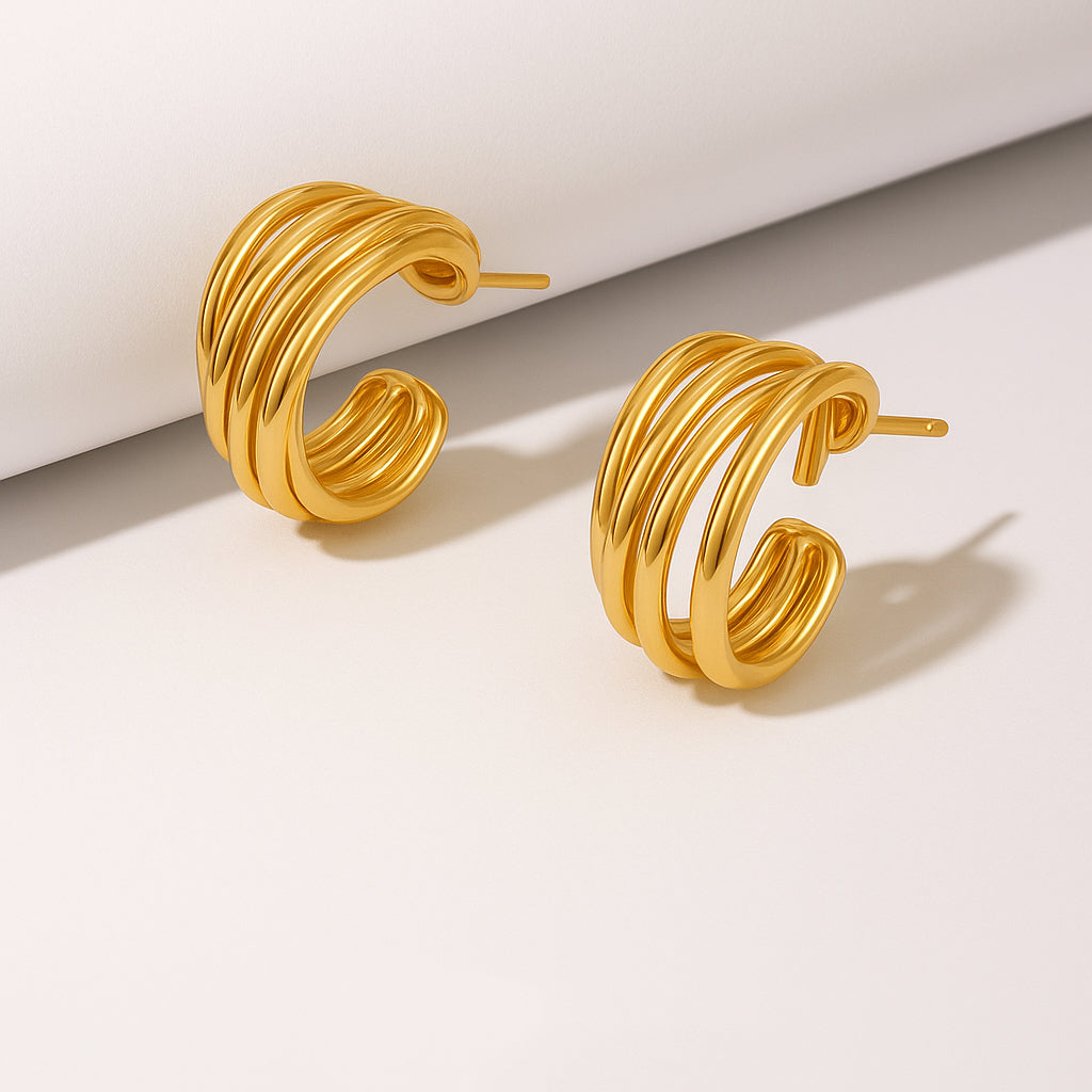 Bold curves meet radiant shine in the Twist & Glow Gold Hoops. Featuring three sculptural gold bands seamlessly twisted into one striking hoop, these earrings offer a dynamic silhouette full of movement and light. Lightweight yet impactful, they bring everyday glamour with a bold, modern edge — perfect for elevating both casual looks and evening ensembles.