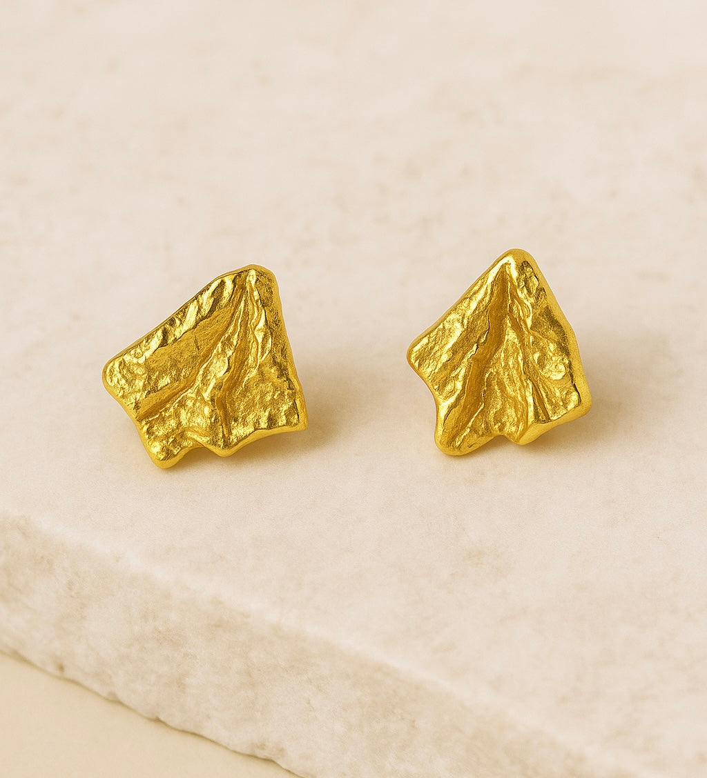 Vein of Gold earrings embody the raw beauty of the earth with their molten-textured surface, reminiscent of leaf veins or cracked terrain. Cast in radiant gold, these sculptural studs are lightweight yet full of character — offering a grounded, nature-inspired statement for everyday wear. Perfect for those who love understated elegance with organic charm.