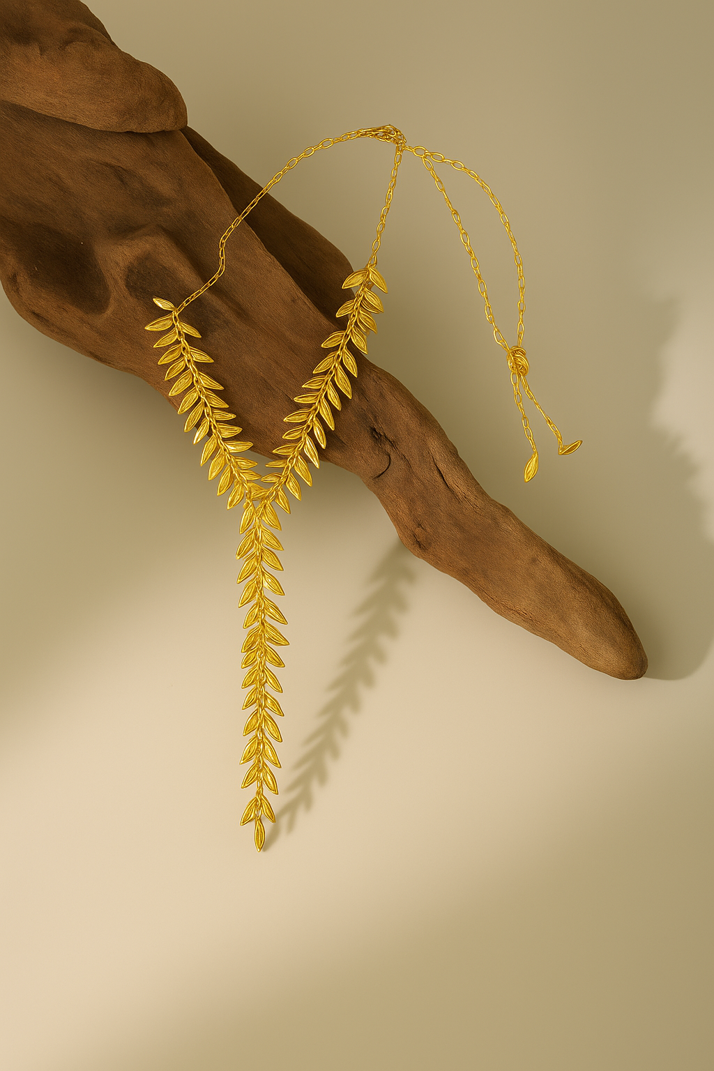 Wheat Whisper is a graceful Y-shaped necklace that captures the poetic sway of wheat fields in a soft breeze. Delicately crafted with cascading golden fronds, it elongates the neckline and adds a touch of natural movement to your everyday elegance. Lightweight, refined, and full of organic charm — it's the perfect accessory for layering or wearing solo.